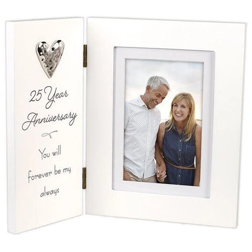 25th Anniversary is a milestone, a special occasion that ought to be celebrated. Capture special memories in this elegant hinged wood frame with a silver heart. Share the memory for a lifetime.