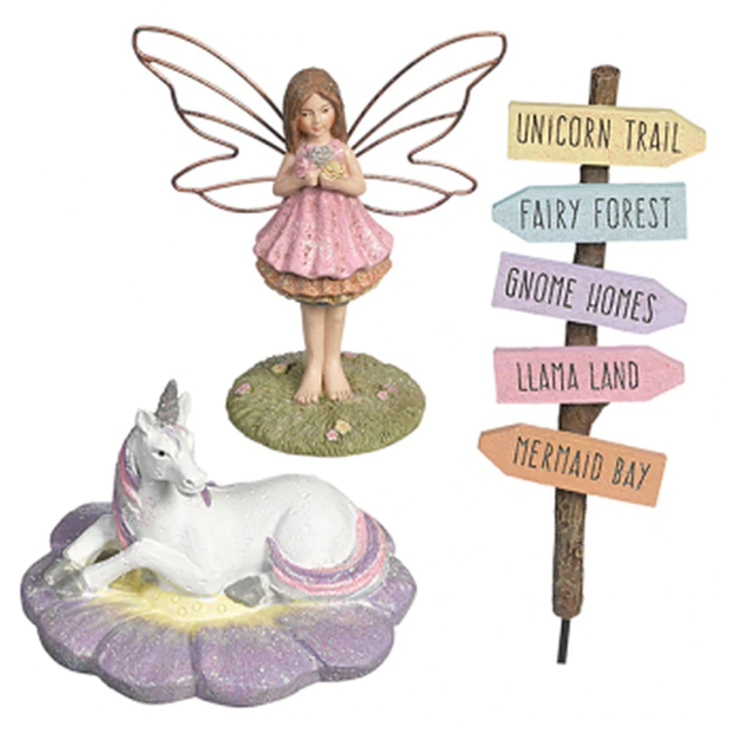 Unicorn Sign Fairy Collectible Figurines comes as a set of 3; Magic garden pieces include a unicorn laying on a flower, a fairy with wings, and a sign reading “Unicorn trail, Fairy forest, Gnome homes, Llama land, Mermaid bay”. Figurine is made of resin stone with pink glitter finish. Comes in gift box for easy gifting.
