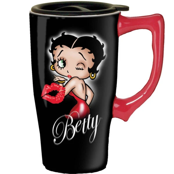 With a classic image of miss Betty winking at you, this is the perfect gift able for the Betty Boop fan in your life! this ceramic travel mug is perfect for anyone on the go. With a locking lid and a skid plated bottom this mug is the perfect travel companion. It is both microwave and dishwasher safe. Holds 16oz.