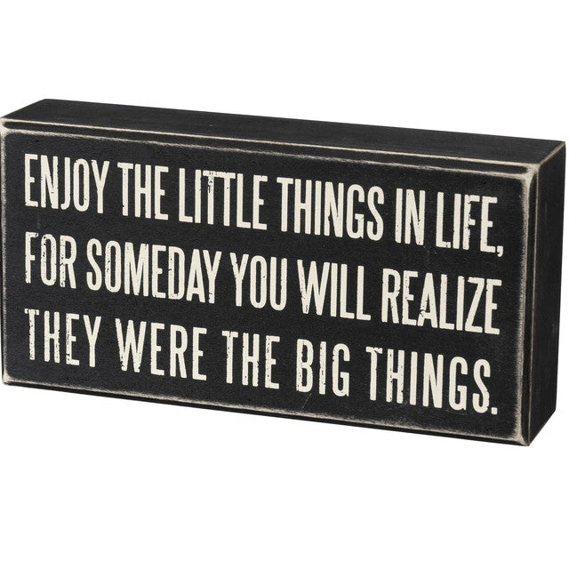 A classic black and white wooden box sign featuring a distressed “Enjoy The Little Things In Life, For Someday You Will Realize They Were The Big Things” sentiment. Easy to hang or can free-stand alone.