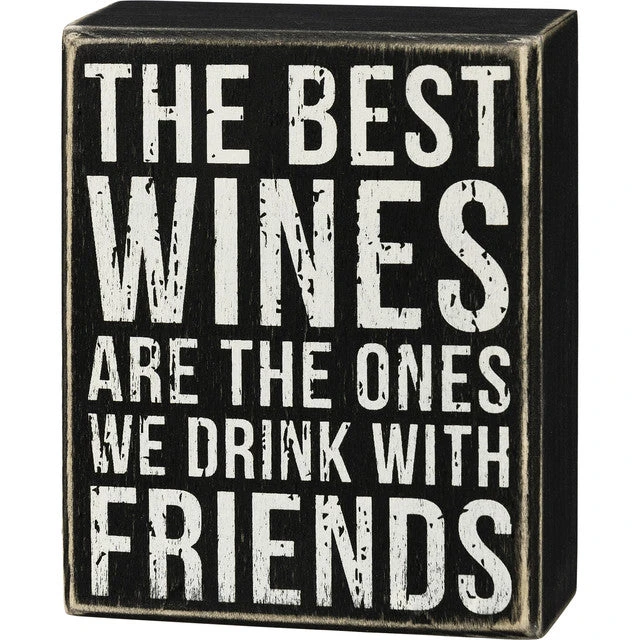 A classic black and white wooden box sign featuring a distressed “The Best Wines Are The Ones We Drink With Friends” sentiment. Easy to hang or can free-stand alone.