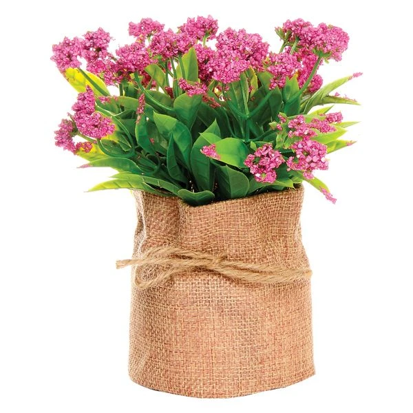 Blossom Bucket decorative dark pink cluster flowers in burlap bag. Measures 3.25″L x 6″H