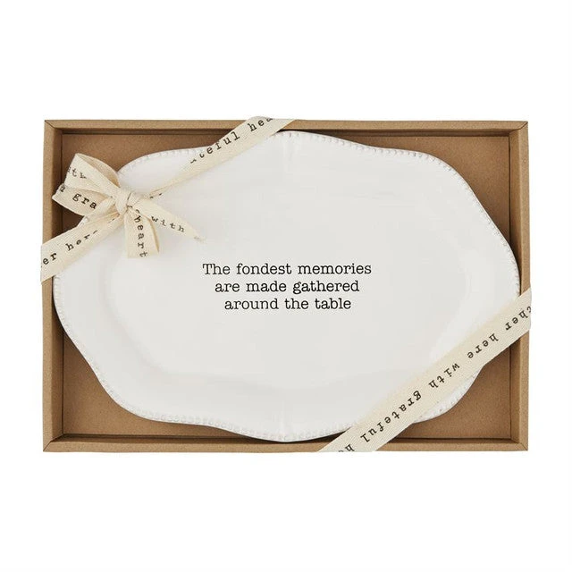 Scallop ceramic platter with debossed sentiment surface and raised beaded detail. Material: Dolomite. Size: 8 1/2″ x 12 1/2″.