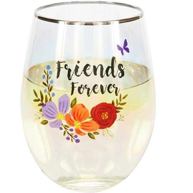 Perfect for gifting to a friend. “Friends Forever” text and floral decal is applied to the front of the glass.