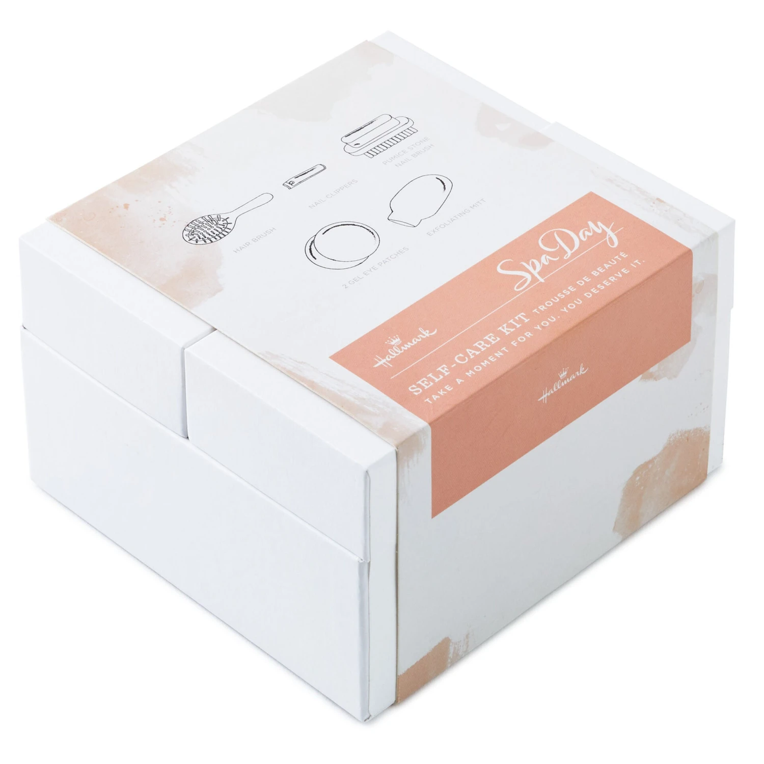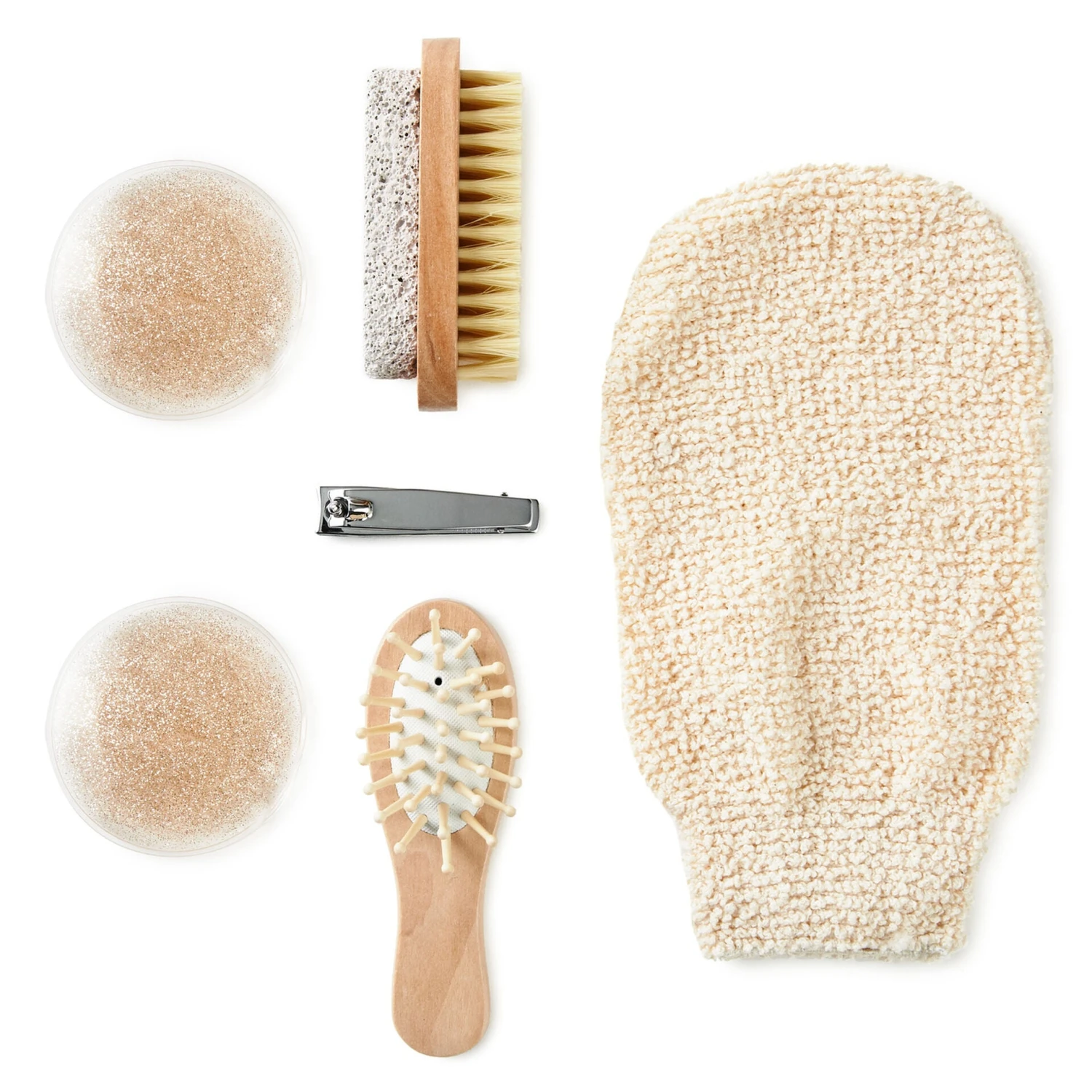 - Spa day self-care kit includes hair brush, nail clippers, pumice stone nail brush, 2 gel eye patches and exfoliating mitt.