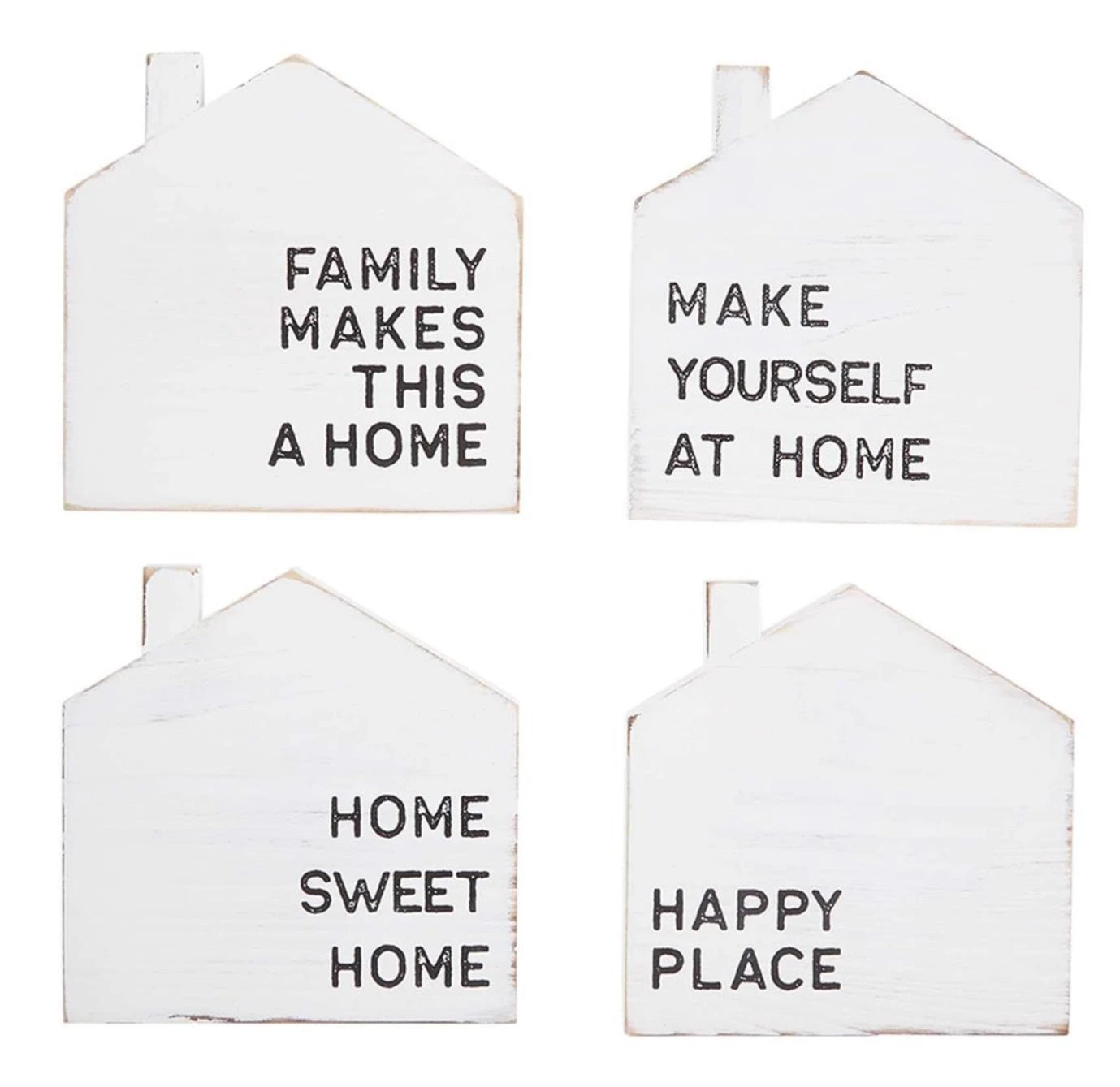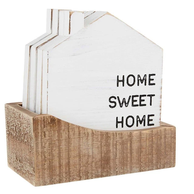 5-piece set. Printed wood house shaped coasters arrive with wooden storage caddy. Sentiments include: “Home Sweet Home”, “Happy Place”, Family Makes This Place A Home”, “Make Yourself At Home”
