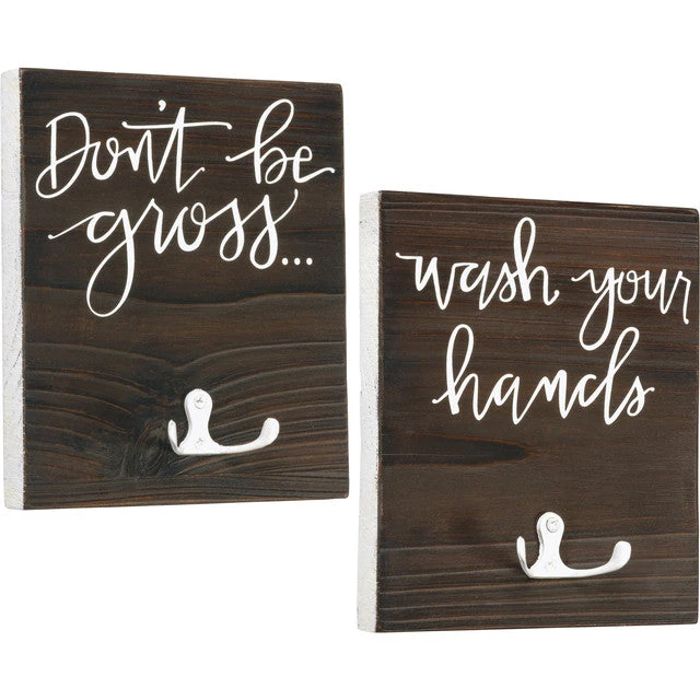 A set of two wooden hook boards featuring metal hooks and “Don’t Be Gross…” and “Wash Your Hands” sentiments. Perfect for hanging hand towels in a bathroom. Complements well with other pieces in collection to create a cohesive display.