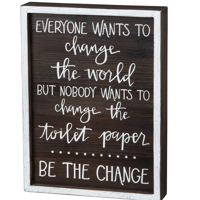 A wooden inset box sign featuring an engraved “Everyone Wants To Change The World But No One Wants To Change The Toilet Paper – Be The Change” sentiment. Inside edge features dry brush technique. Complements well with other pieces in collection to create a cohesive display.