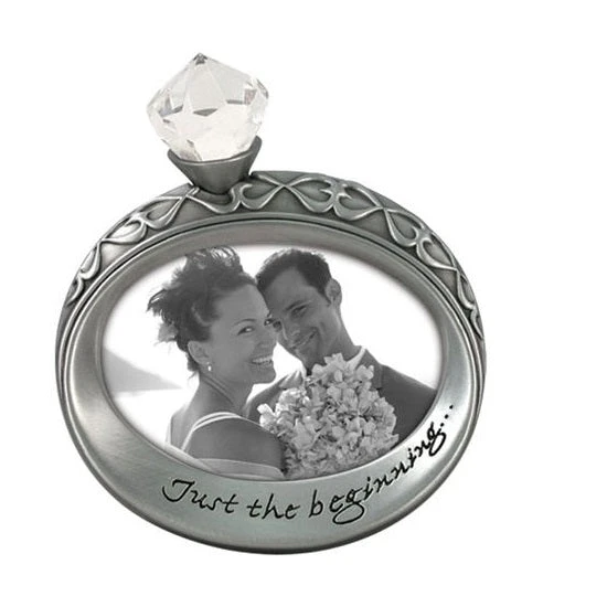 Display a favorite photograph from all those photos you took together on your wedding day. This uniquely shaped diamond ring silver frame with a faux gemstone features an oval 2″ opening along with a “Just the Beginning” embossed message underneath. Makes the perfect gift for engagements or weddings.