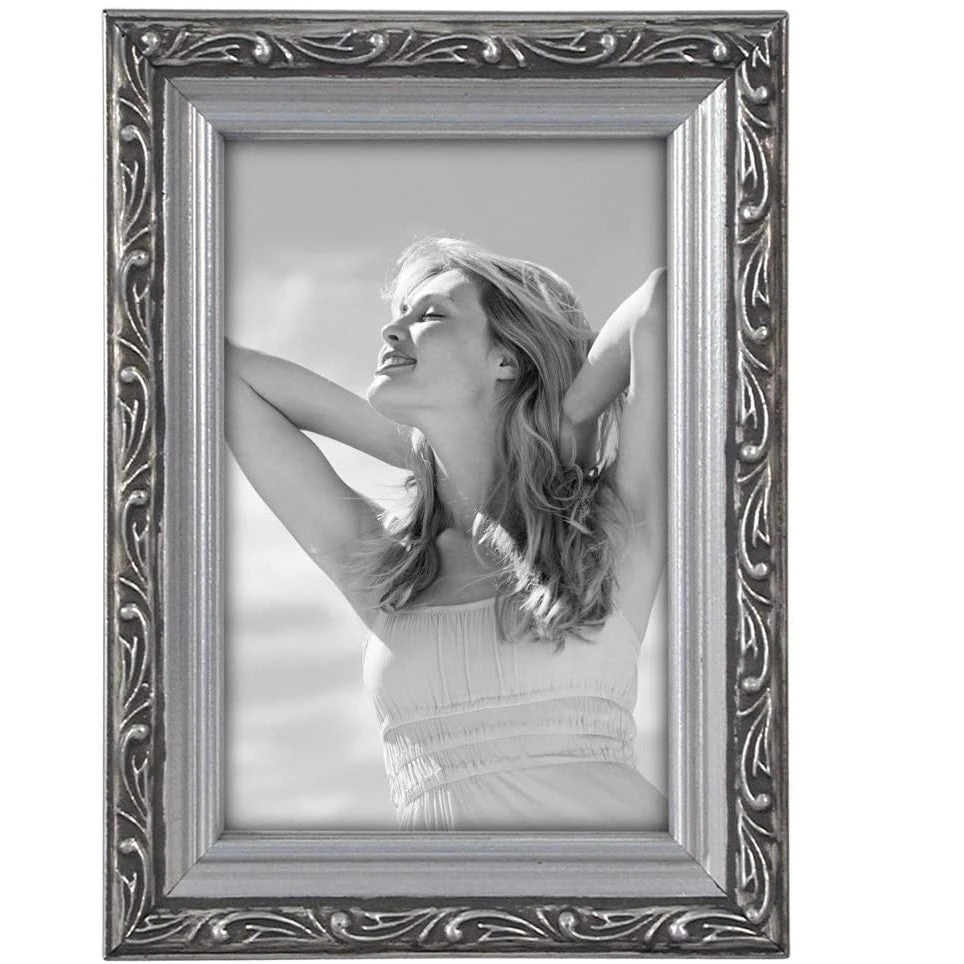 Display cherished memories in this stylish silver color metal frame which features dimension bezel edge trim. The beveled border around the frame is unique and elegant.