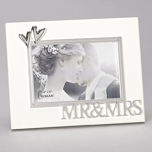 Celebrate the Big Day! This beautiful Mr. and Mrs. frame features ivory wood set in a silver outline. Two shiny silver hearts adorn the top left corner. The words “Mr&Mrs” adorn the bottom. It is so simple yet so elegant. It’s a much appreciated wedding gift. Holds a 4″x6″ photo. Made with lead free zinc alloy. 7″H