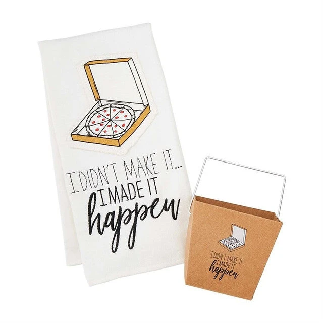 This whimsical towel features a printed sentiment with appliquéd icon “I Didn’t Make It, I Made It Happen”. It arrives in a take-out style gift box.