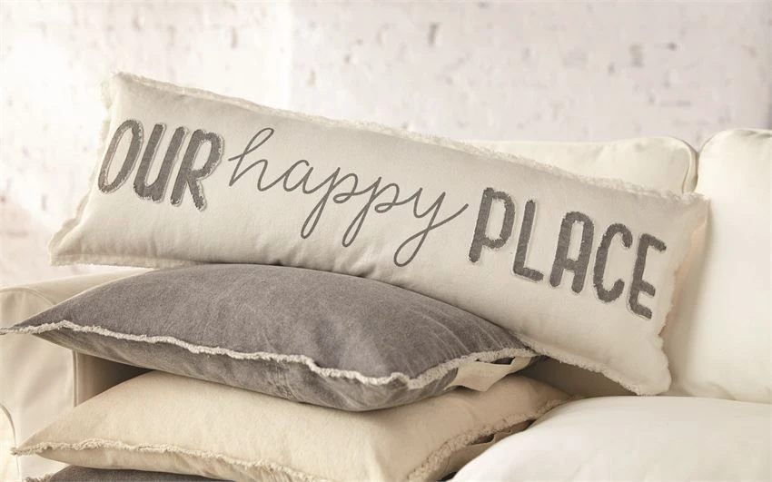 Cream washed canvas long pillow features gray washed canvas appliquéd and printed sentiment. Zipper closure. Material: Cotton. Size: 12″ x 35 1/2″