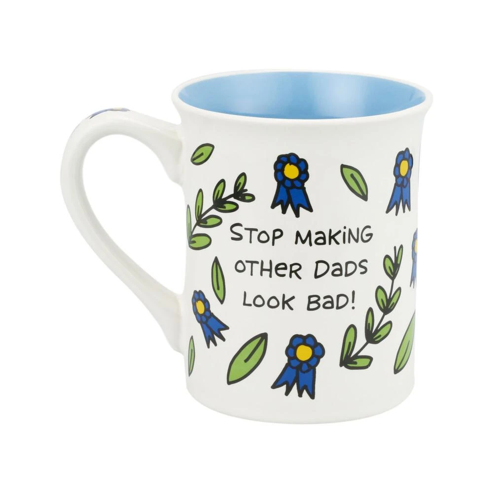 Covered in color and blue ribbons, this winsome mug awards it’s bearer Dad of the Year. With a plea to stop making other dads look bad, let dad show off his superiority every morning. This 16 oz stoneware mug is strictly reserved for the best dads!