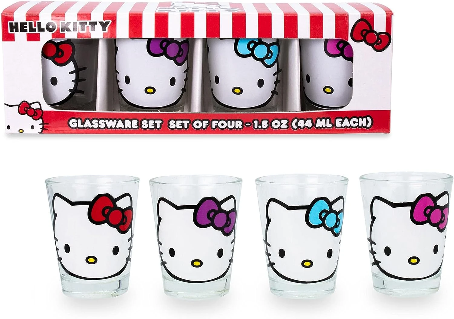 - GET A TASTE OF CUTENESS: One of the sweetest friends around, Hello Kitty appears here in adorable fashion. Each shot glass features the popular idol’s signature expression styled with different bow colors