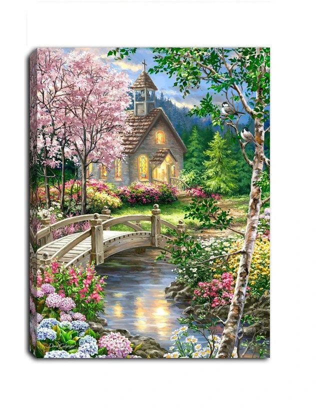 In the beautiful springtime garden, walk across the bridge to the chapel, all lit up with its colorful stain glass windows. The water reflects its lights. The colorful blooms twinkle. It’s a lovely scene.