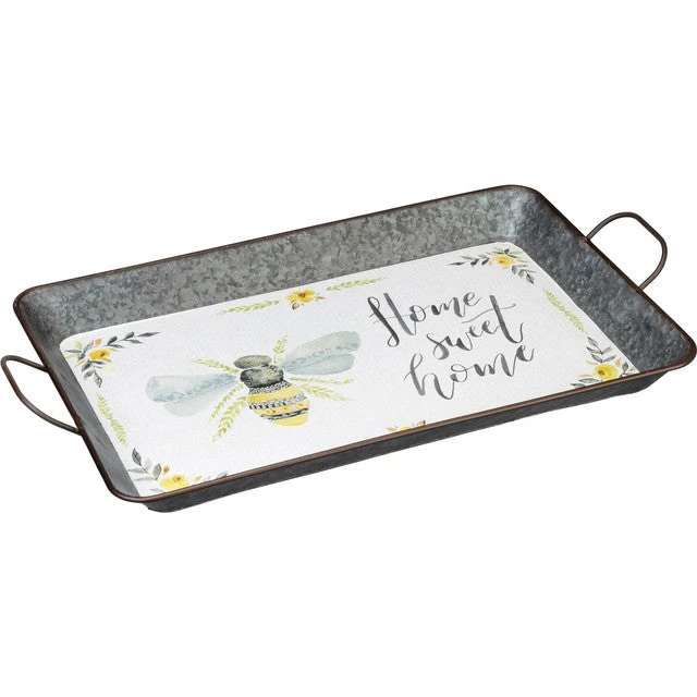 A metal tray featuring watercolor artwork, “Home Sweet Home” sentiment, and bumblebee designs, and floral border. Contains dual side handles for easy carrying. Complements well with coordinating pieces in collection for a refreshing spring display.
