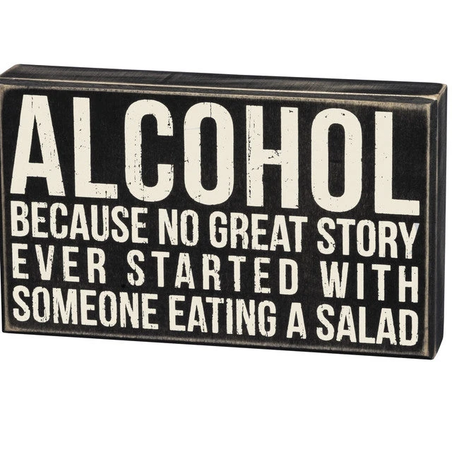 A classic black and white wooden box sign lending a distressed “Alcohol – Because No Great Story Ever Started With Someone Eating A Salad” sentiment. Easy to hang or can free-stand alone.
