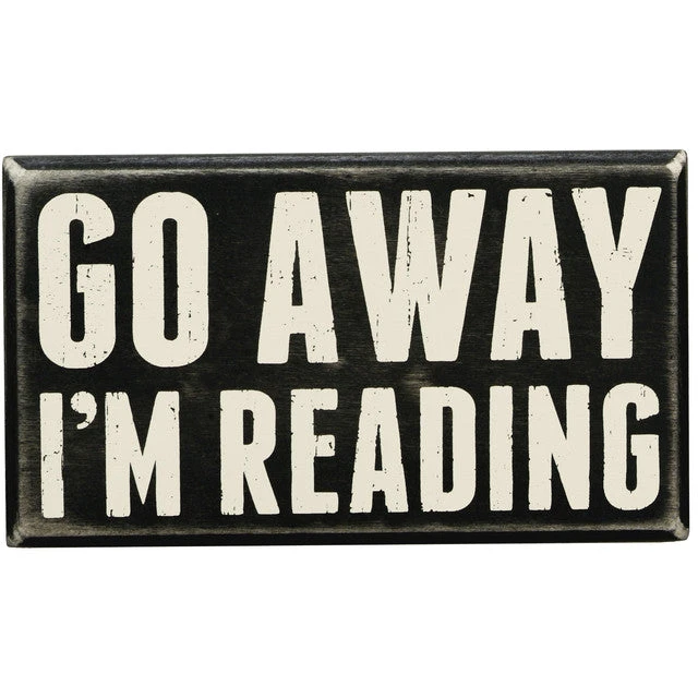 A classic black and white wooden box sign featuring a distressed “Go Away – I’m Reading” sentiment. Easy to hang or can free-stand alone.