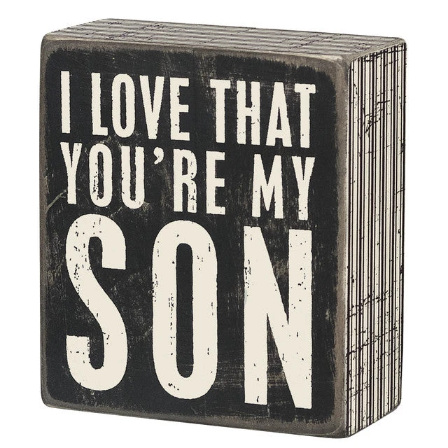 A classic black and white wooden box sign featuring a distressed “I Love That You’re My Son” sentiment with striped trim designs. Easy to hang or can free-stand alone.