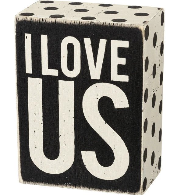 A classic black and white wooden box sign featuring a distressed “I Love Us” sentiment with polka dot trim designs. Easy to hang or can free-stand alone.