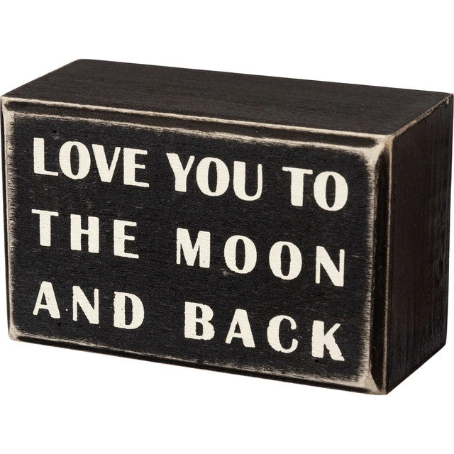 A classic black and white wooden box sign featuring a distressed “Love You To The Moon And Back” sentiment. Easy to hang or can free-stand alone.