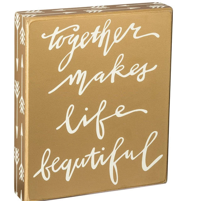 A classic gold and cream color wooden box sign featuring a script “Together Makes Life Beautiful” sentiment arrows trim designs. Easy to hang or can free-stand alone.